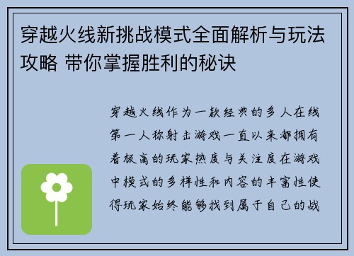 穿越火线新挑战模式全面解析与玩法攻略 带你掌握胜利的秘诀