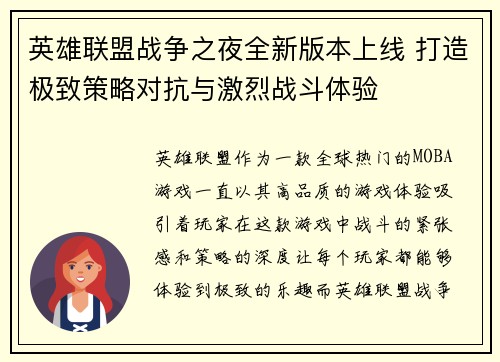 英雄联盟战争之夜全新版本上线 打造极致策略对抗与激烈战斗体验