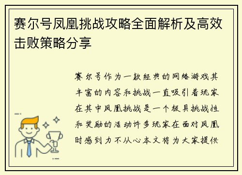 赛尔号凤凰挑战攻略全面解析及高效击败策略分享